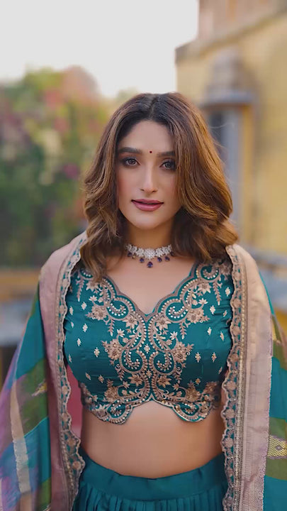 - This stunning firozi color vichitra silk lehenga choli is a perfect blend of elegance and tradition, beautifully adorn with sequince and thread embroidery work.