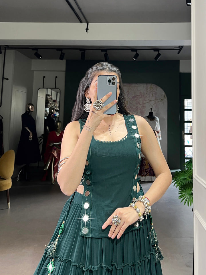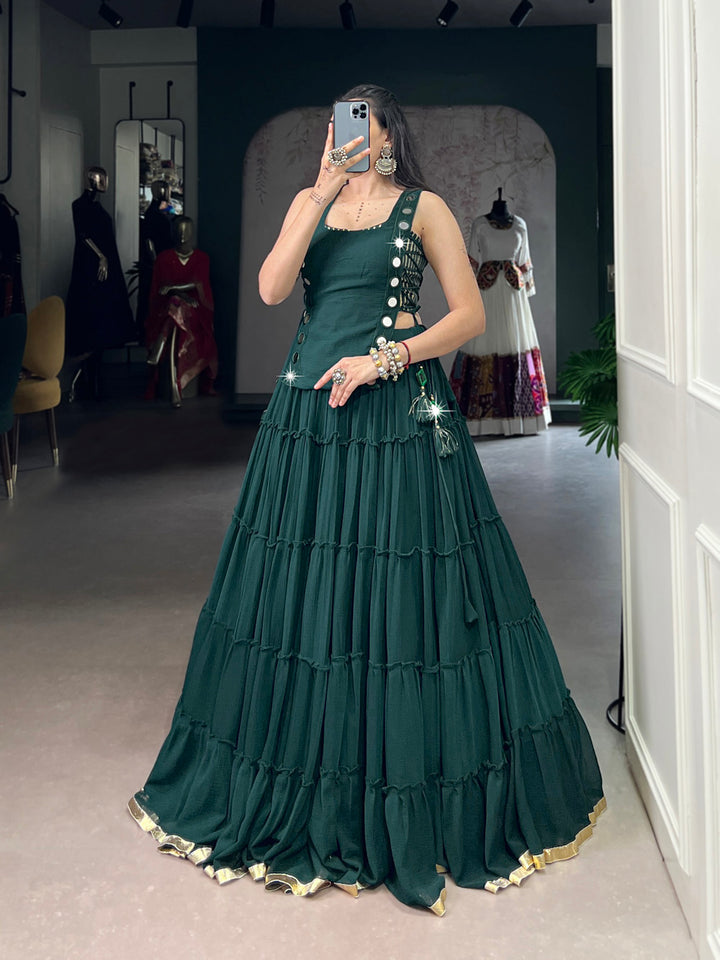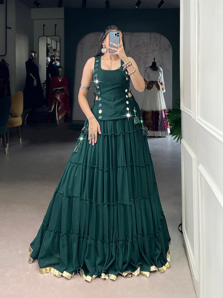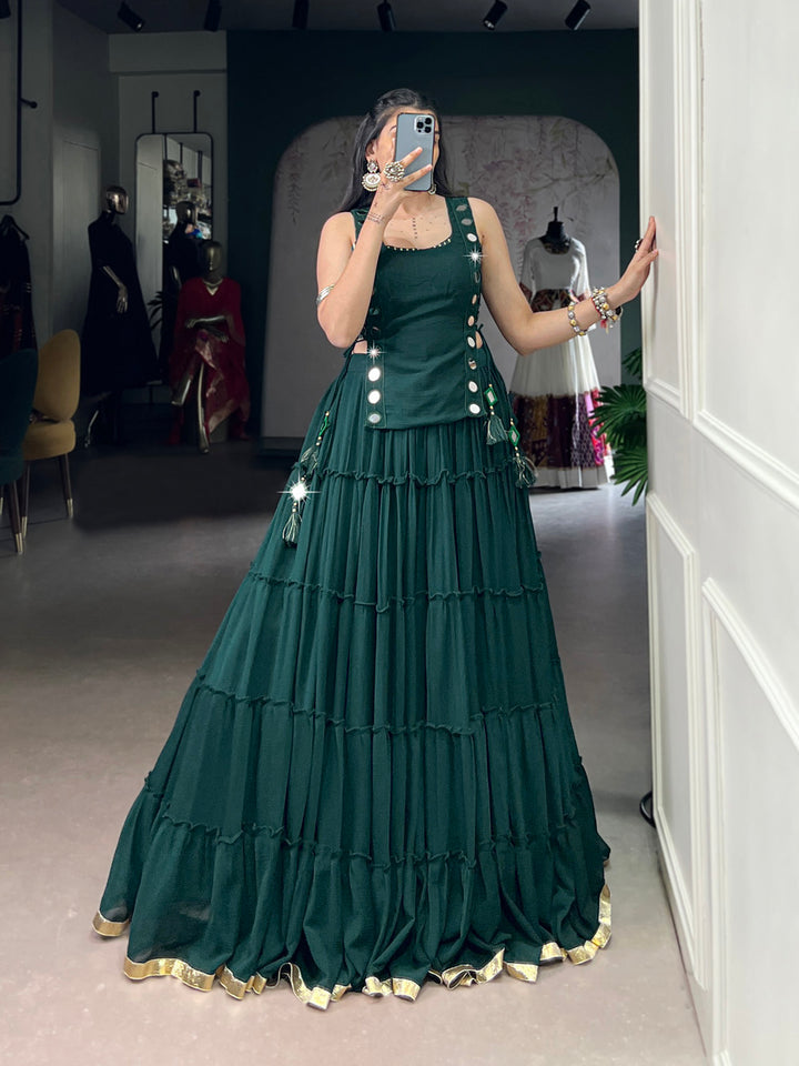 Green Color Embossed Design Lace Border Marbel Chaniya Choli