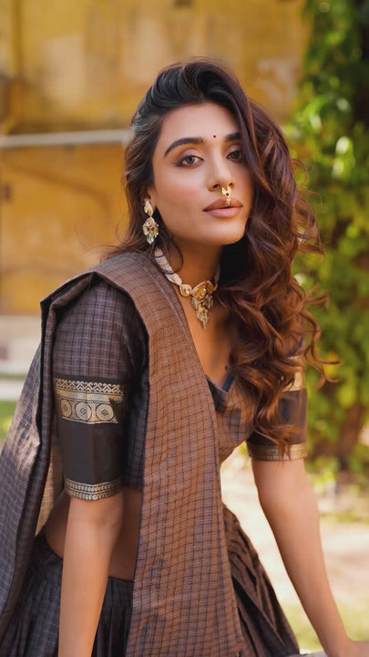 Grey Color Chex With Zari weaving Work Chettinad Cotton Lehenga Choli