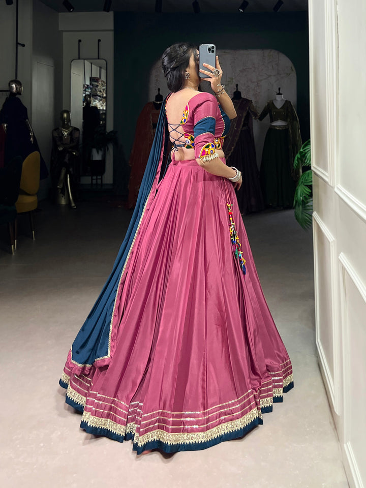 - Step into navratri with this graceful magenta pink silk crepe chaniya choli highlighted with delicate sequins and thread embroidery gotta patti lace border.