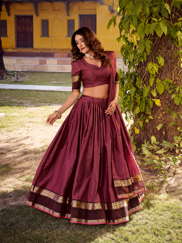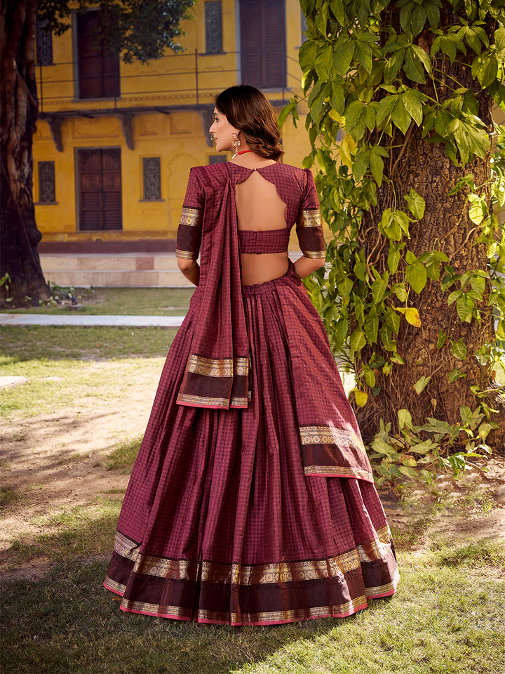 Mulberry Color Chex With Zari weaving Work Chettinad Cotton Lehenga Choli