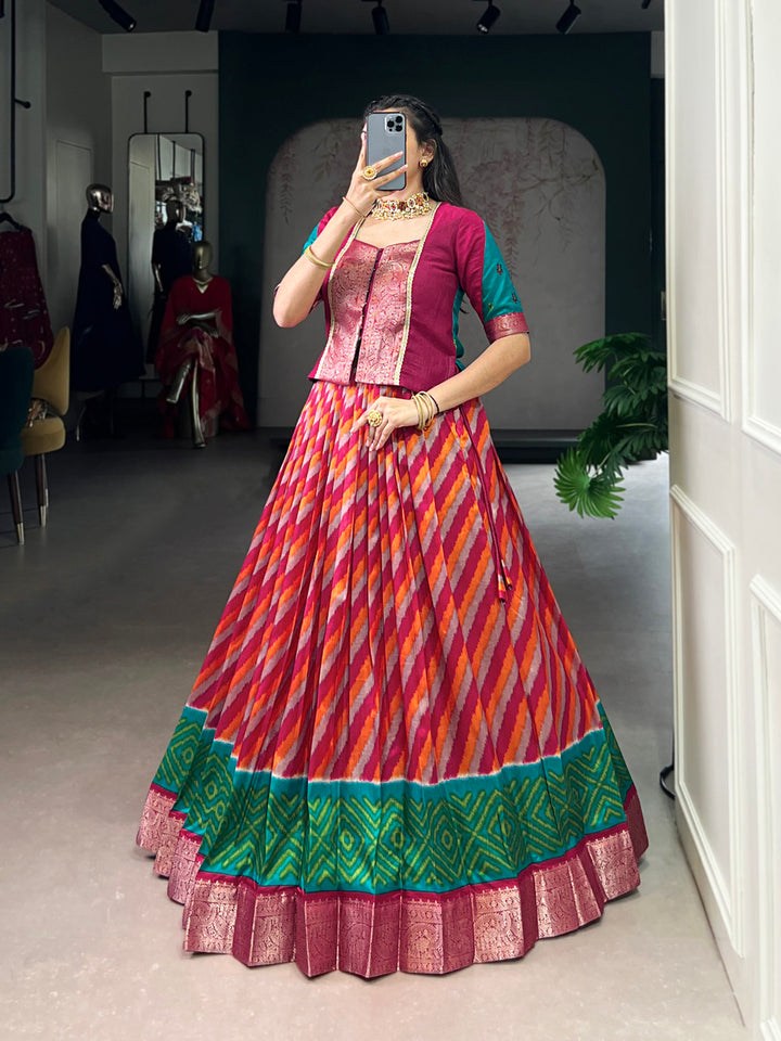 - Dress up traditional and ethnic attire is a style icon just like this trendy red color lehenga formed with tasar silk material constructed leheriya print.