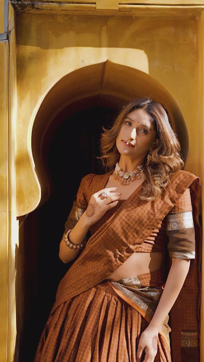 - Step into elegance with this exquisite rust orange color lehenga choli set, designed in chettinad cotton fabric and adorned with chex and zari weaving work.