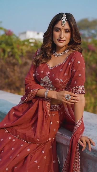- This exquisite lehenga choli set is a perfect blend of opulence and tradition, crafted from salmon color chocolate crush with sequins and thread embroidery work.