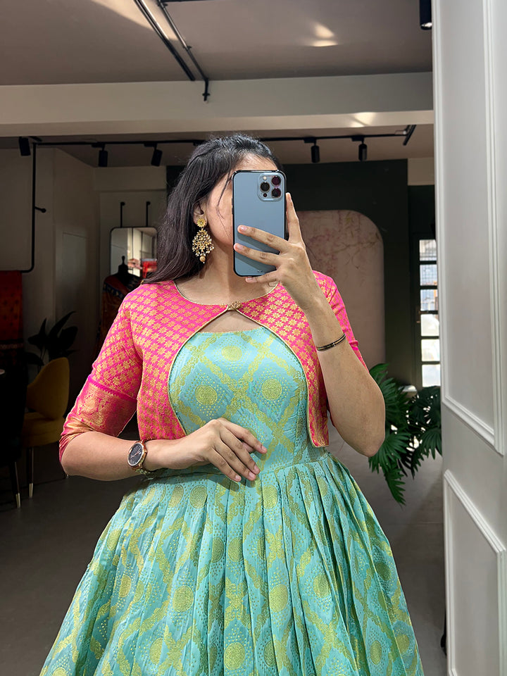 Sky Blue Color Zari Weaving Work Silk Dress