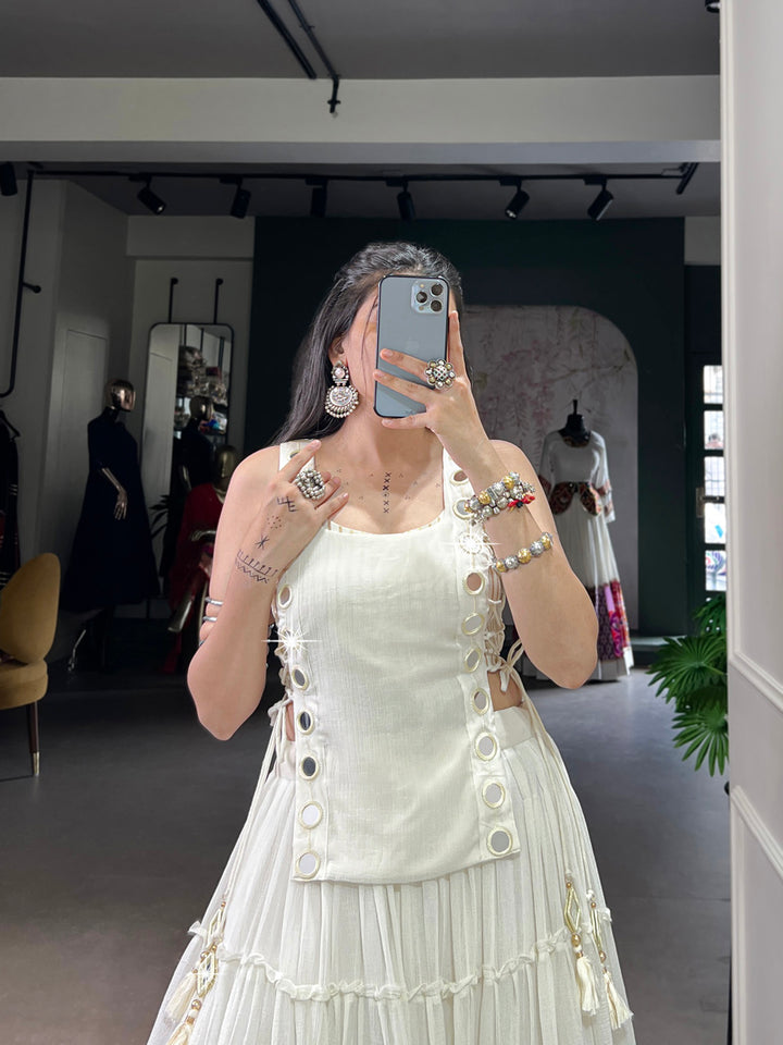 - This stunning outfit features a graceful flared lehenga made from marbal fabric with white color lehenga .