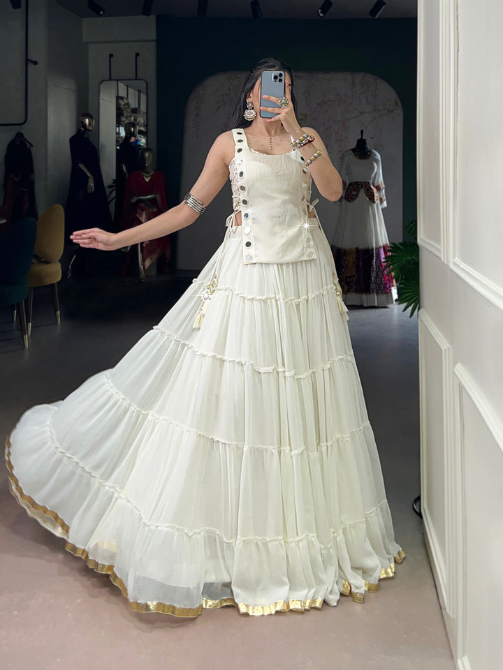 White Color Embossed Design Lace Border Marbel Chaniya Choli