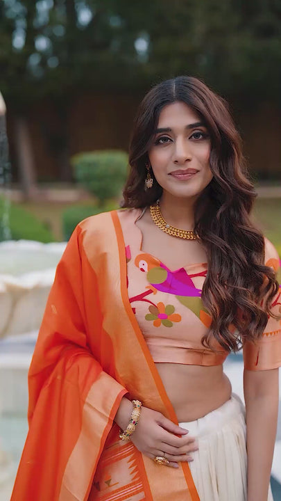 - It comes with a jacquard silk blouse piece and also comes with jacquard silk orange color dupatta with zari weaving work and tassels.